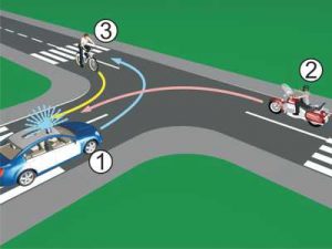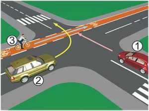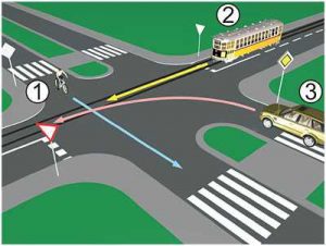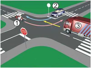 5 bodovaKako u saobraćajnoj situaciji kao na slici mora postupiti vozač vozila broj 2?