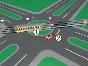 5 bodovaKako u saobraćajnoj situaciji kao na slici mora postupiti vozač vozila broj 1?